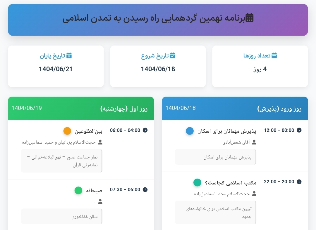برنامه نهمین گردهمایی راه رسیدن به تمدن اسلامی برنامه نهمین گردهمایی راه رسیدن به تمدن اسلامی تعداد روزها 4 روز تاریخ شروع 1404/06/18 تاریخ پایان 1404/06/21 روز ورود (پذیرش) 1404/06/18...