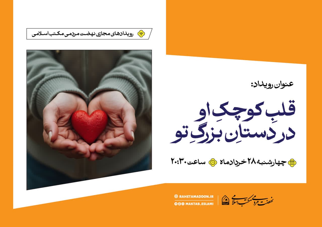 رویداد مجازی «قلب کوچک او، در دستان بزرگ تو»چهارشنبه 28 خردادماهساعت 20:30 در این رویداد به ضرورت خانواده محوری و پرورش مستقیم فرزند توسط خانواده پرداخته شده و روشی کاملا...